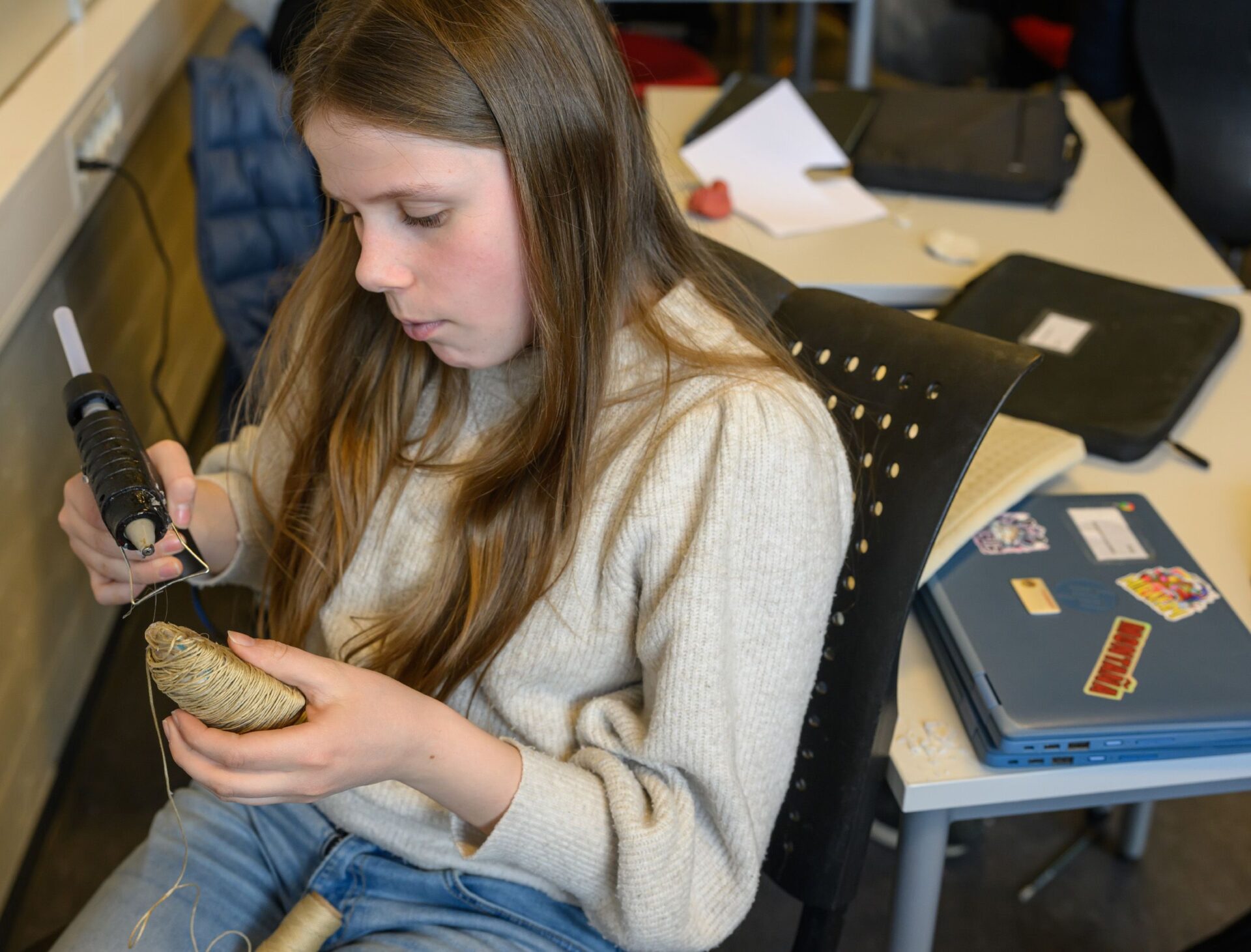 Josephine Emilie Valkner tvinner hyssing rundt en rund form. Hun snur litt på den for å lime hyssingen fast, og da ser vi det – en hval.