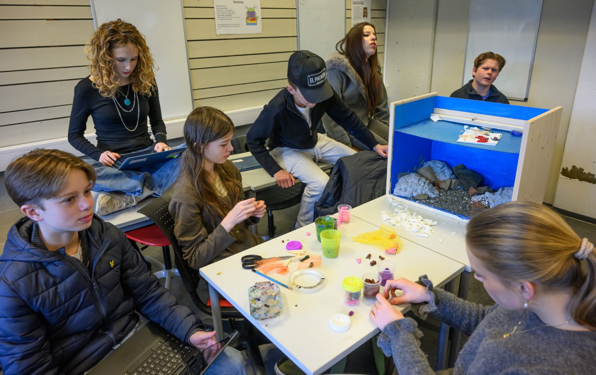 Lærer Paal har laget montre av tre og pleksiglass som elevene fyller med historier. Bygningsskum blir til havbunn, befolket med fisk, krabber, koraller og andre organismer. Ett monter skal fortelle om forurensning, oppvarming og koralldød. Et annet viser garn og teiner som går tapt og blir liggende i havet, der de fortsetter å fange fisk og skalldyr før de etter mange år brytes ned til mikroplast.