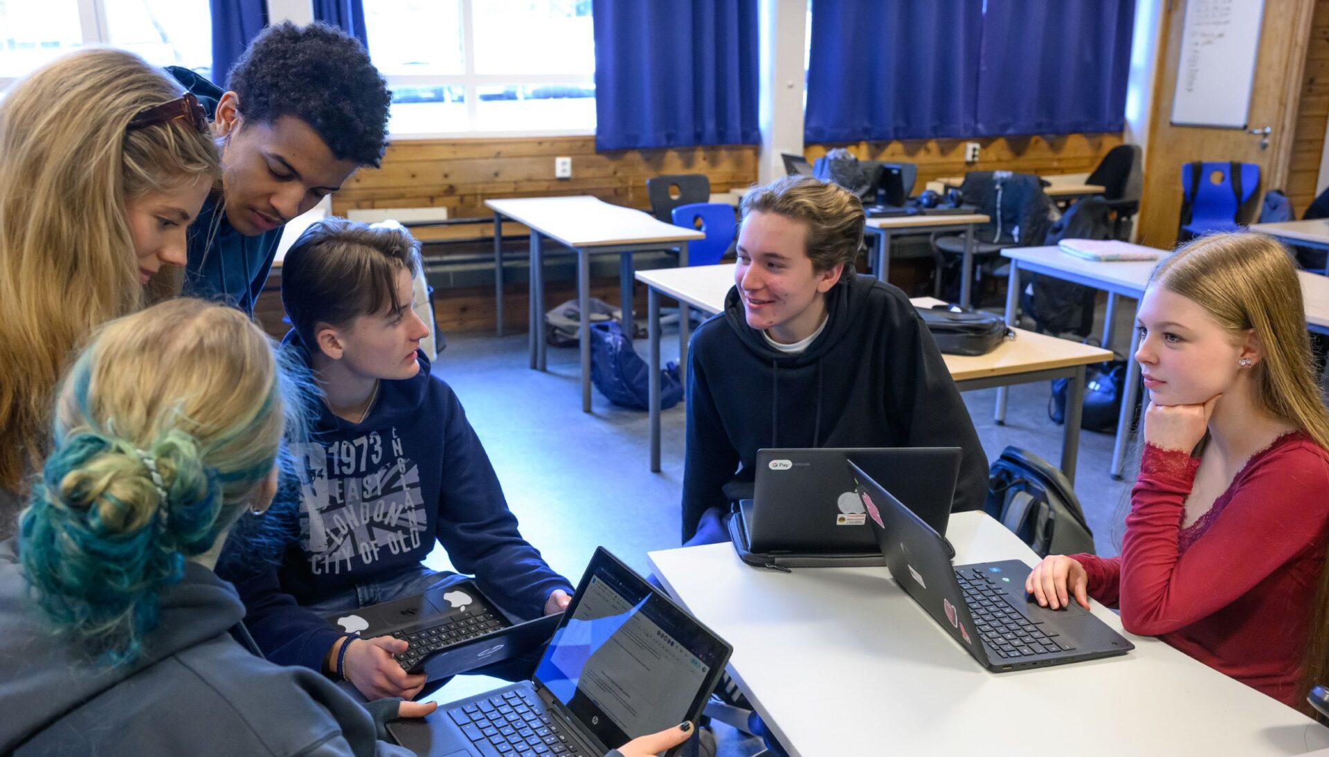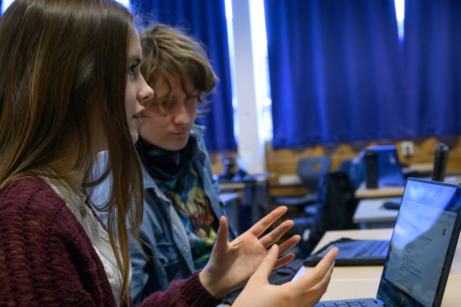 Klasserommet er overraskende rolig. Elevene prater lavmælt sammen og skriver på PC-ene sine. Sonja Elise Engebretsen er den eneste som arbeider med papir og blyant.